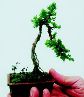 圖2 為了改善不穩定狀況,同時彌補盆面左方的空白,嘗試添置兩只鉛質仙鶴擺件,結果并不理想,無法有效根治盆景整體畫面失衡的弊病。