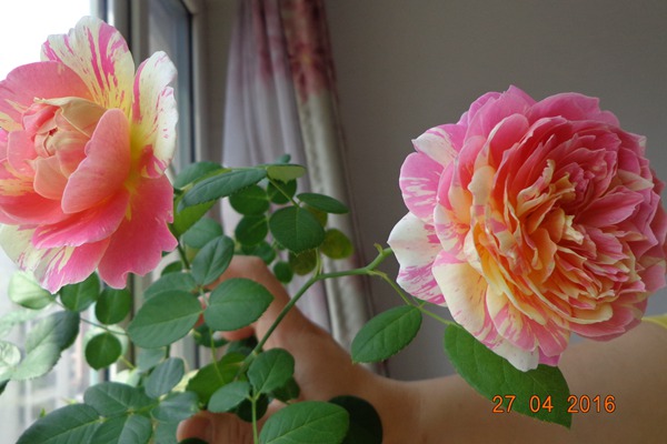 莫奈是個可愛與獨特相結合的藤本月季品種。它植株高度大概在100-130厘米左右,冠幅寬度大概110厘米左右,花徑平均數大概在7厘米左右,花瓣數量大概在41枚瓣。莫奈開花的形狀是環形,它也是一款條紋月季,它是一種橙黃色及淡粉色相間的中大花徑的藤本月季,它擁有粉色、黃色和奶油色的三種柔和色彩,有著特別強的吸引力。莫奈花的顏色還會隨著氣溫變化,在高溫季節顏色會變淡甚至是消失、花朵變小,這是很多條紋月季的共性,但氣溫一旦轉涼它的花色就會恢復、條紋變得明顯,花朵變得飽滿。這三種顏色隨意地灑在每一片花瓣,顏色出乎意料的合拍,就像莫奈最為著名印象派繪畫中的一副一樣,不得不說這種花很神奇,充滿藝術魅力。