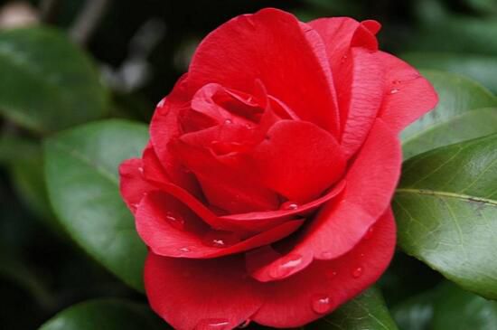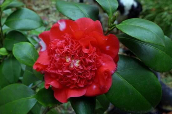 火瀑布山茶花,看其名能想到其花色肯定是如火般鮮艷的紅,花朵碩大為牡丹花型,外部花瓣包圍著內(nèi)部緊簇生長(zhǎng)的花瓣,有如灑上去的白色斑點(diǎn),花期較長(zhǎng)在1~4月份。