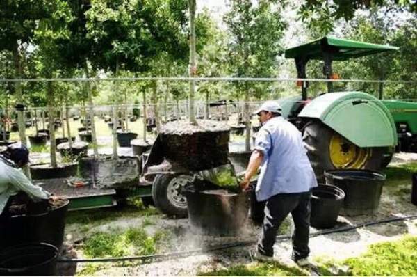 一、傳統的地栽土球苗B&B(BALL & BURLAP)。凡是把樹苗種在土中,移栽時挖起,運走再栽植的苗木生產方式,在美國統稱為裸根種植法(BARE ROOT CULTURE)。要出售或施工時,用人工或機器把樹苗挖出,再用一種類似于無紡布一類的材料(BURLAP)包裹起來,這種苗被稱為B & B(BALL & BURLAP)(注:BALL表示樹的土球,而BURLAP為無紡布)。