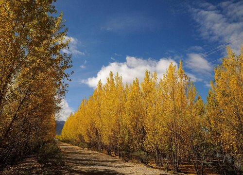 白楊樹的葉子為卵圓形,葉片的先端較短,葉子的形狀就像是一個桃子,也像一個心形,更像是一把小扇子。白楊樹的葉片顏色隨著季節(jié)變化而變化,在初秋時期還是綠色的,而到了秋末冬初落葉前,它的葉片就變成黃色的,風一吹整個樹上的葉片就會漫天起舞。